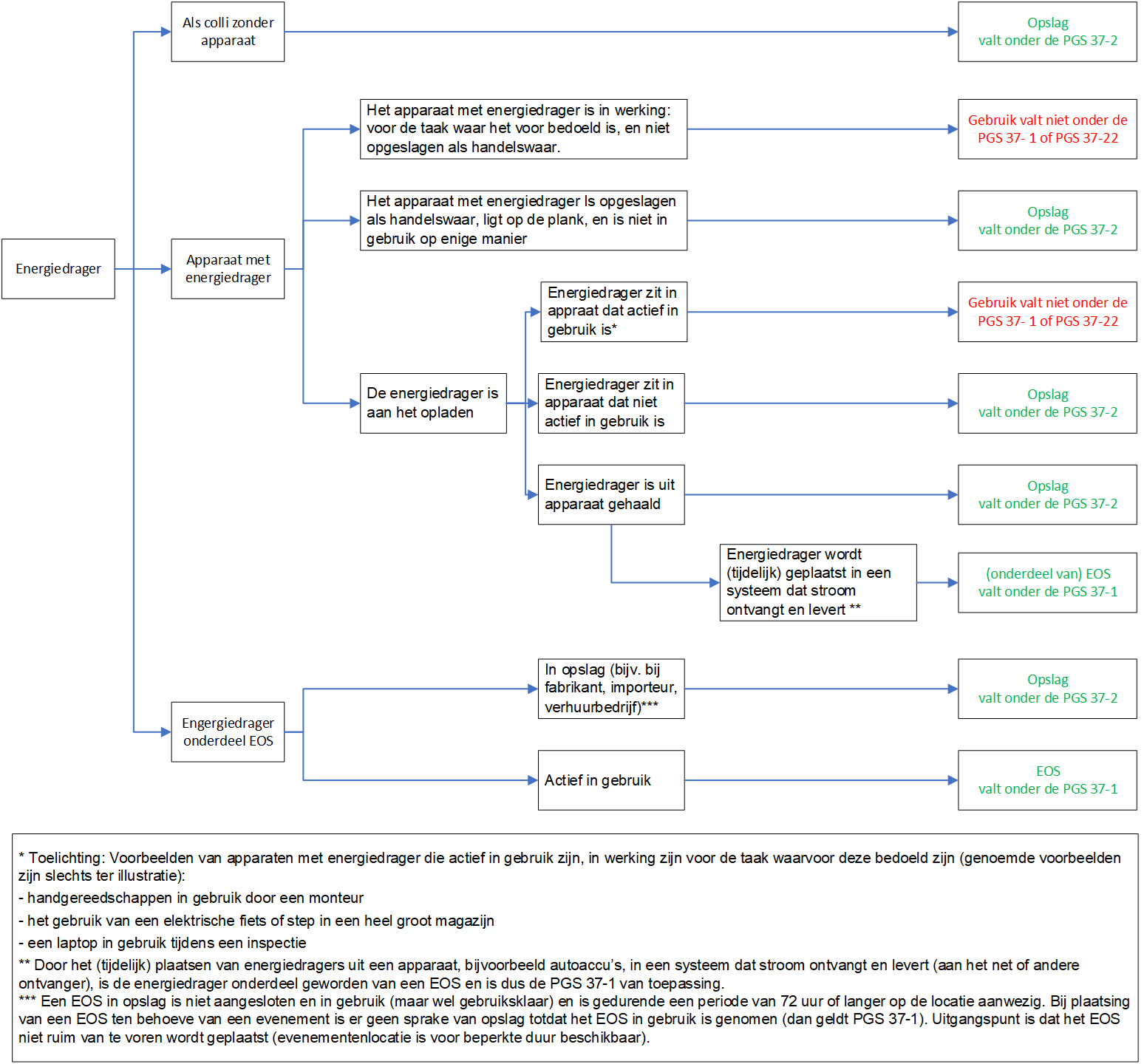 In de Publicatiereeks Gevaarlijke Stoffen (PGS) gaat PGS 37-2 over de opslag van lithiumhoudende energiedragers. Daarbij gelden bepaalde ondergrenzen voor de hoeveelheid (kg) per brandcompartiment, zie paragraaf 1.2, tabel 2 van PGS 37-2. Bij overschrijding van de ondergrens geldt dat als de lithiumbatterij in het apparaat blijft tijdens het opladen, PGS 37-2 niet van toepassing is. Dit wordt schematisch toegelicht in figuur 1 van PGS 37-2.