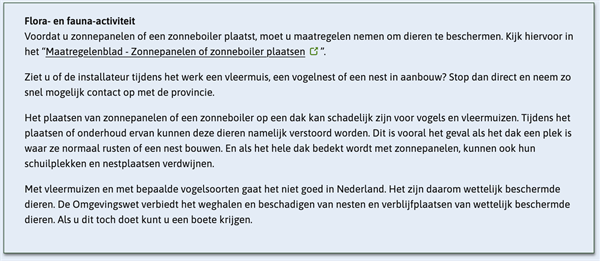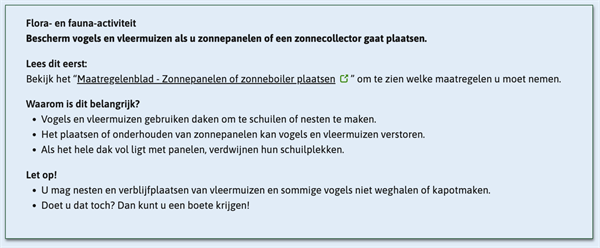 In het vervolgonderzoek begrijpen deelnemers de toelichting over flora en fauna op de resultaatpagina van de Vergunningcheck goed. Ze concluderen op basis daarvan nu terecht dat plaatsing van zonnepanelen mogelijk is, mits er voldoende ruimte is en buiten het broedseizoen wordt gewerkt.