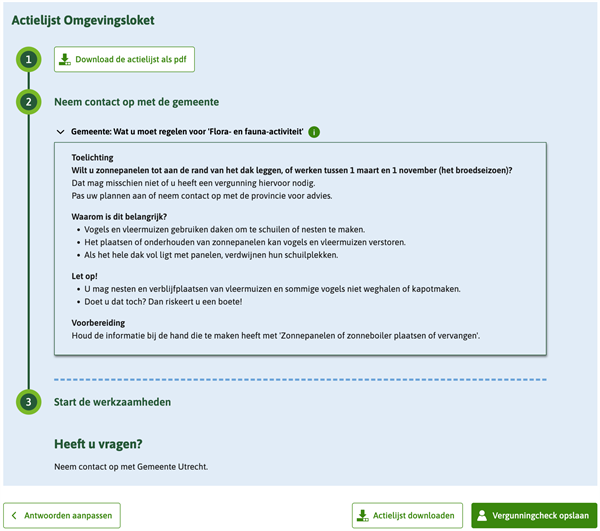 Hierdoor kregen deelnemers in de vergunningsvrije situatie alleen het resultaat ‘Om rekening mee te houden’ te zien met de informatie over flora en fauna. Ook de formulering, presentatie en structurering van de toelichting over flora en fauna was aangepast. Ten slotte waren de vragen aangepast die tijdens de eerste ronde vaak fout beantwoord werden of waar deelnemers lang over deden.
