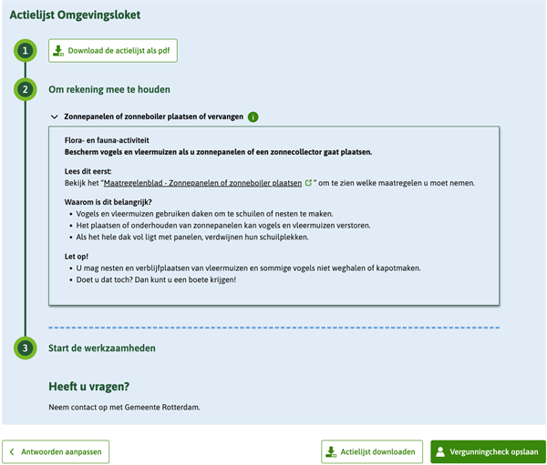 Toon bij het beantwoorden van de vragen direct de gevolgen van keuzes als dat mogelijk is. En geef een indicatie van mogelijke onderzoekskosten als er kosten zijn. Dit maakt het makkelijker voor initiatiefnemers om te beslissen zonder eerst contact te hoeven opnemen met de overheidsinstantie. - Geef meer duidelijkheid bij de uitkomst vergunningvrij