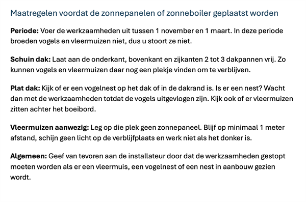 - Broedseizoen: deelnemers passen plannen aan en doen installatie buiten het broedseizoen