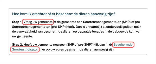 Het maatregelenblad met informatie over beschermde diersoorten werd goed gelezen en begrepen, maar de verwijzingen naar het Soortenmanagementplan (SMP) en de Beschermde SoortenIndicator (BeSI) zijn mogelijk momenten waarop gebruikers afhaken. - Vragen: stel 1 vraag tegelijk