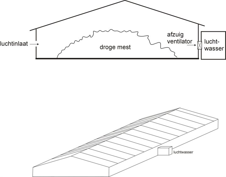 - De lucht uit de mestopslagloods mag alleen via het biologisch luchtwassysteem de loods verlaten. Dit geldt ook tijdens het afvoeren van mest uit de loods.