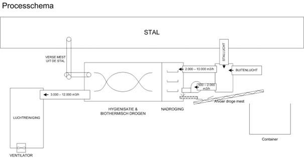 De mest van de mestbanden wordt in een geïsoleerde trommel gebracht. In deze trommel wordt de mest onder geconditioneerde omstandigheden biothermisch gedroogd met een aeroob proces. Hiertoe wordt continu lucht in de trommel gebracht. Door dit proces wordt de mest gedroogd tot een drogestofgehalte van ongeveer 70%. De mest wordt nagedroogd tot meer dan 80% ds door in een vervolgstap extra lucht door de mest te leiden. Alle lucht uit het proces (inclusief die uit de nadroging) wordt behandeld in een luchtwassysteem. Hiermee wordt de emissie van ammoniak beperkt. Voor een beschrijving van het werkingsprincipe van een chemisch luchtwassysteem wordt verwezen naar de systeembeschrijving van het betreffende chemische luchtwassysteem.